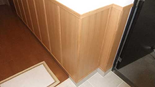 1・玄関からリビングにつながる廊下の木製腰壁について。