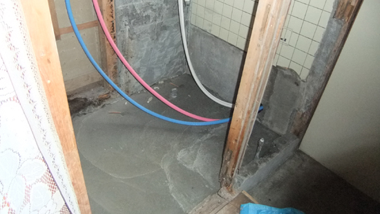 新たに排水・給水・給湯の配管をして システムバス据付け用の土間コンクリートを